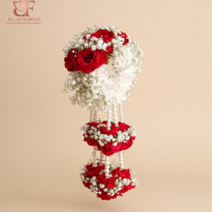 This elegant handcrafted floral piece is made using fresh red roses, white chrysanthemums, and delicate baby’s breath (gypsophila), finished with