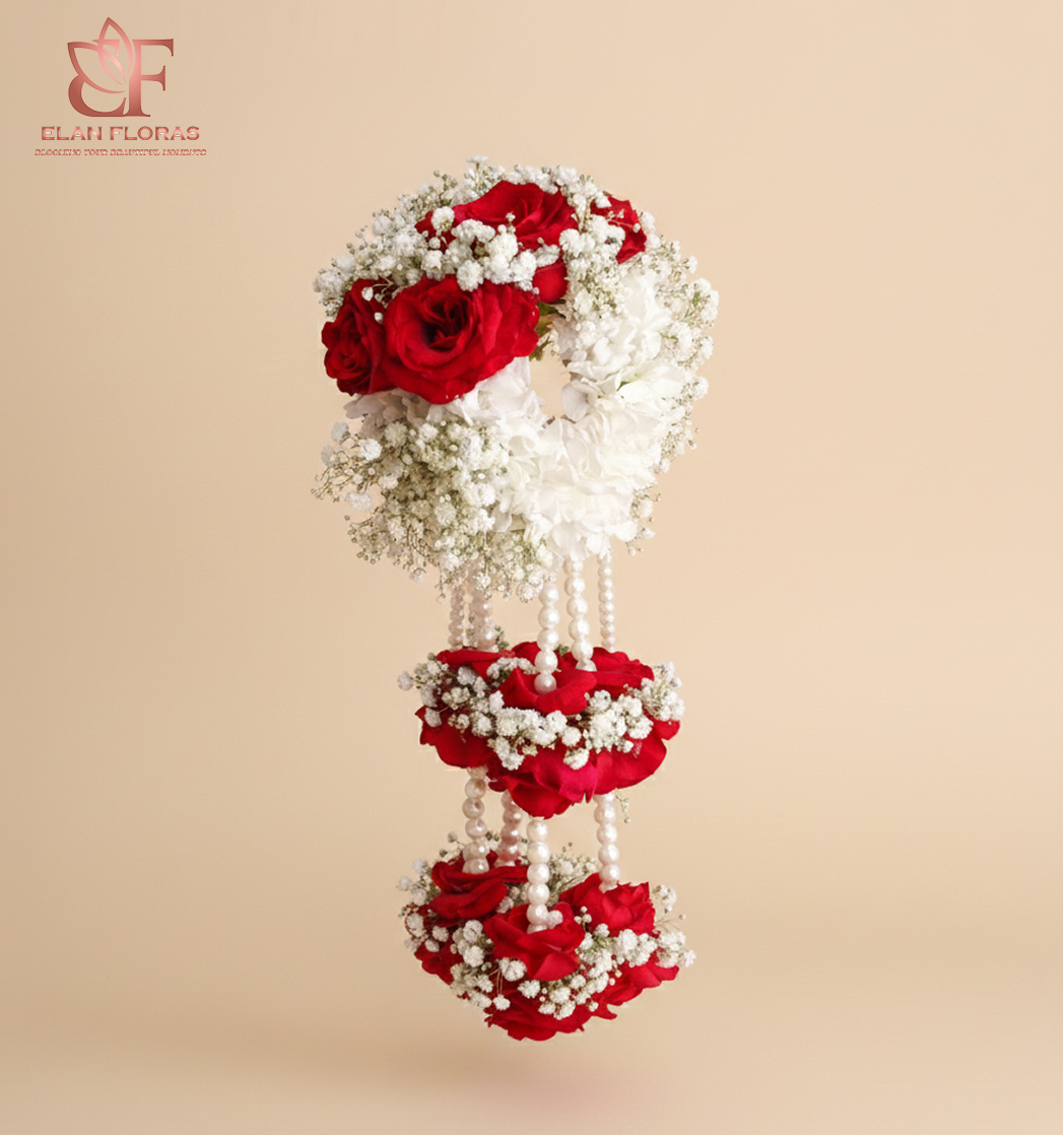 This elegant handcrafted floral piece is made using fresh red roses, white chrysanthemums, and delicate baby’s breath (gypsophila), finished with pearl string detailing for a graceful look. The red and white color combination adds a romantic and traditional touch